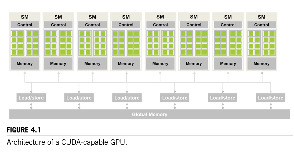 Streaming Multiprocess (SM): highly threaded, each has multiple streaming processors/CUDA cores (or just cores)