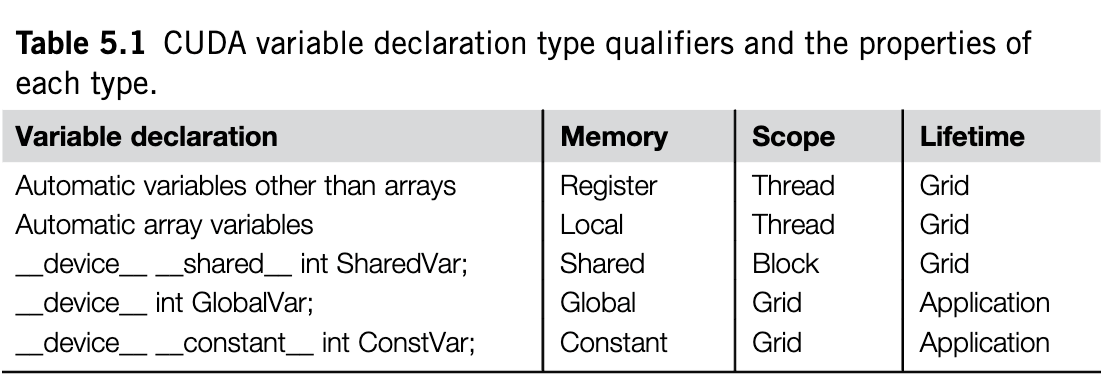 For tiled matmul, each thread block uses $TILE_WIDTH^2 * 4B + TILE_WIDTH^2* 4B)/(TILE_WIDTH^2 threads)=8 B/thread$$, which means that the kernel’s occupancy is not limited by shared memory